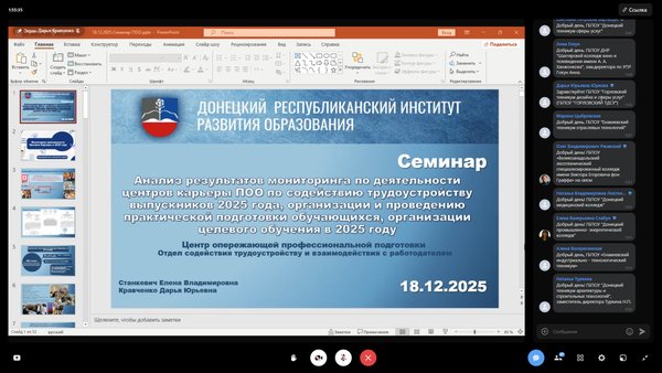 18 декабря 2025 года с целью повышения эффективности работы профессиональных образовательных организаций по содействию занятости выпускников, в соответствии с планом работы на 2025 год, в ГБОУ ДПО «ДОНЕЦКИЙ РЕСПУБЛИКАНСКИЙ ИНСТИТУТ РАЗВИТИЯ ОБРАЗОВАНИЯ» состоялся семинар «Основные направления деятельности Центров карьеры профессиональных образовательных организаций по организации содействия занятости выпускников» (на платформе ИКОП «Сферум»).