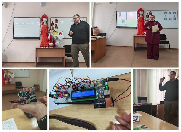 Кулик Михаил Сергеевич, заведующий кабинетом информатики, ИКТ, труда и черчения, продемонстрировал возможности использования платформы Arduino и микроконтроллеров как эффективного средства достижения предметных и метапредметных результатов при изучении алгоритмизации и управления.