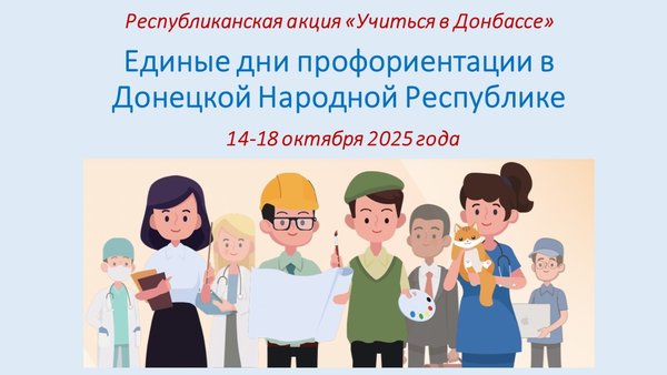 По поручению Главы Донецкой Народной Республики Д. В. Пушилина, в рамках реализации плана мероприятий Республиканской акции «Учиться в Донбассе!», с целью обеспечения раннего и осознанного выбора обучающимися будущей профессии с учётом перспектив развития экономики и социальной сферы Донецкой Народной Республики в общеобразовательных организациях региона 14 октября 2025 г. стартовали Единые профориентационные дни.