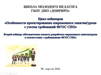 08 апреля 2026 года на базе ГБОУ ДПО «Донецкий республиканский институт развития образования» в рамках работы Школы молодого педагога в онлайн-формате состоялся второй вебинар из цикла «Особенности проектирования современного занятия/урока с учетом требований ФГОС СПО». Второй вебинар цикла посвящен теме «Методические аспекты разработки современного занятия/урока в соответствии с требованиями ФГОС СПО».