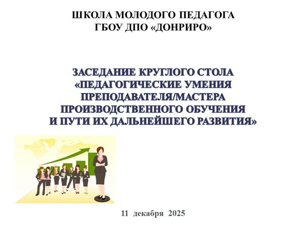 11 декабря 2025 года на базе ГБОУ ДПО «Донецкий республиканский институт развития образования» в рамках работы Школы молодого педагога среднего профессионального образования (далее – СПО) состоялось заседание круглого стола на тему «Педагогические умения преподавателя/мастера производственного обучения и пути их дальнейшего развития».