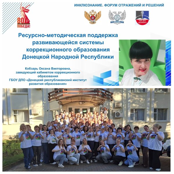 Заведующий кабинетом коррекционного образования Государственного бюджетного образовательного учреждения дополнительного профессионального образования «Донецкий республиканский институт развития образования» Оксана Викторовна Кобзарь в онлайн-режиме приняла участие в III «Форуме отражений и решений» педагогов-дефектологов Краснодарского края, которые входят в профессиональное сообщество «ИнклюЗнание» и представила опыт работы региона на тему «Ресурсно-методическая поддержка развивающейся системы коррекционного образования Донецкой Народной Республики».