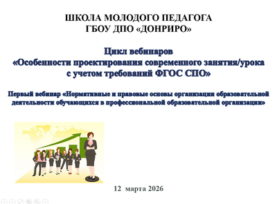 12 марта 2026 года на базе ГБОУ ДПО «Донецкий республиканский институт развития образования» в рамках работы Школы молодого педагога в онлайн-формате состоялся первый вебинар из цикла «Особенности проектирования современного занятия/урока с учетом требований ФГОС СПО». Первый вебинар цикла посвящен теме «Нормативные и правовые основы организации образовательной деятельности обучающихся в профессиональной образовательной организации».