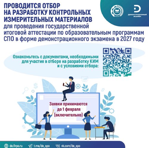 ФГБОУ ДПО «Институт развития профессионального образования» информирует о старте приема заявок на участие в отборе на разработку контрольных измерительных материалов (КИМ) для проведения государственной итоговой аттестации по образовательным программам среднего профессионального образования в форме демонстрационного экзамена в 2027 году. Перечень…